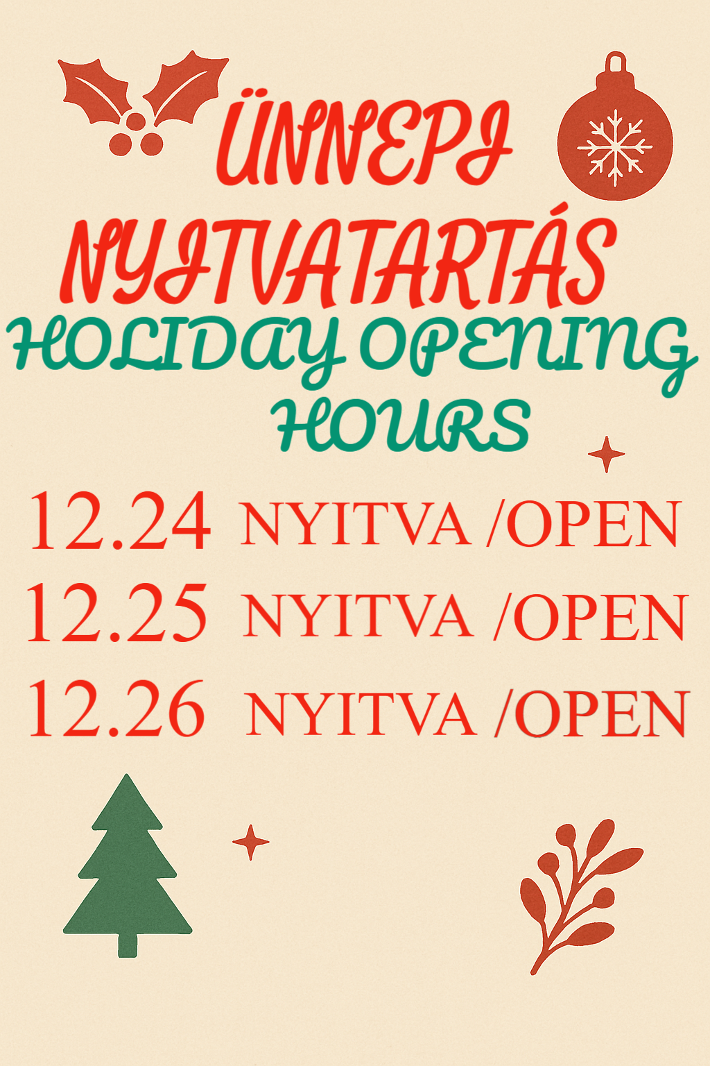 - Wednesday: 00:00 - 24:00 - NON-STOP NYITVATARTÁS, Ünnepnapokon is rendes Nyitvatartással vagyunk